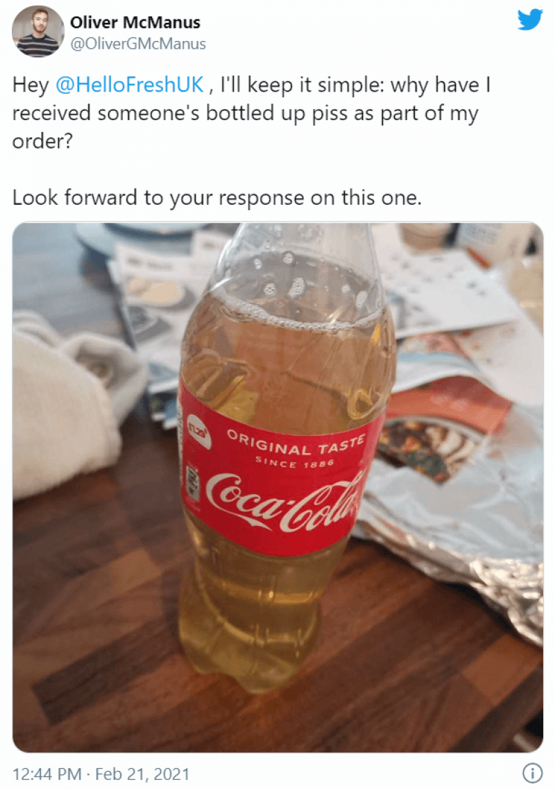 Oliver McManus trof in zijn doos de nodige ingrediënten aan voor zijn maaltijd, maar kreeg nog een extraatje: Iemand zijn gebottelde urine in een colafles. De Brit nagelde het bedrijf op Twitter aan de schandpaal: Hey, ik zal het simpel houden: waarom heb ik iemand zijn pis ontvangen in een fles als deel van mijn bestelling?