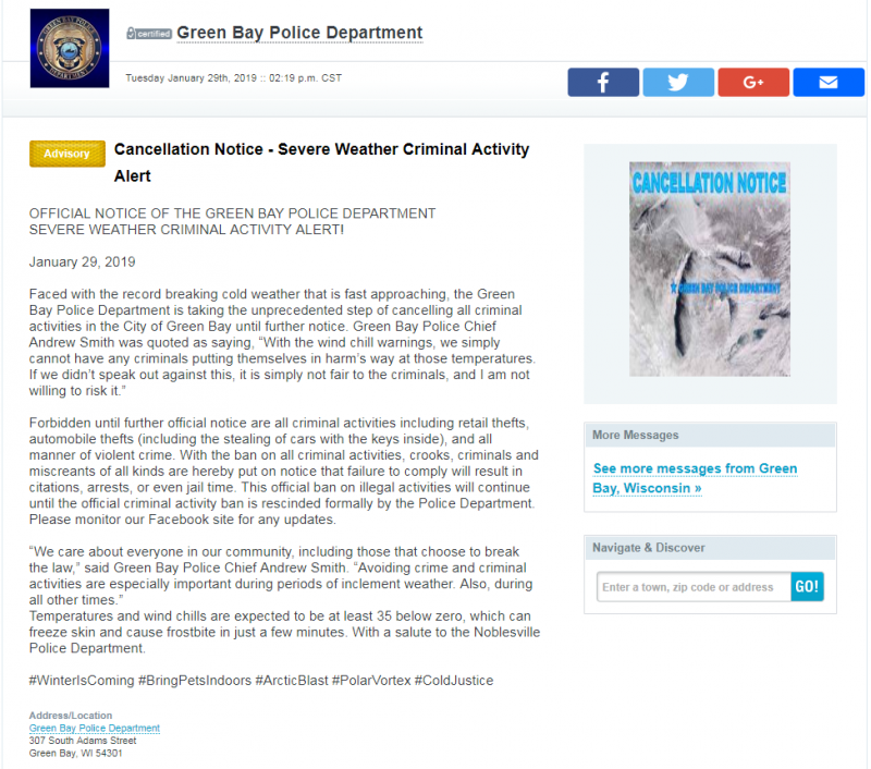 In de staat Wisconsin zakte de temperaturen de voorbije nachten tot bijna -30°. De gevoelstemperatuur daalde zelfs tot -50°. Behoorlijk fris dus. Vanwege de koude annuleren we alle criminele activiteiten in onze stad, klinkt het in een ludieke mededeling op de website van de lokale politie. Met zulke lage gevoelstemperaturen kunnen we het niet riskeren dat criminelen zichzelf in gevaar brengen. Als we ons hier niet over zouden uitspreken zou dat niet eerlijk zijn tegenover de boeven.
