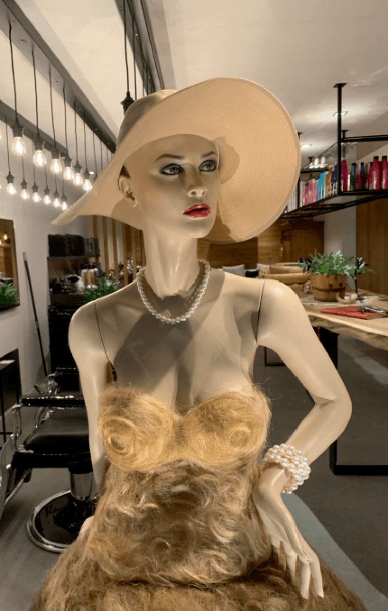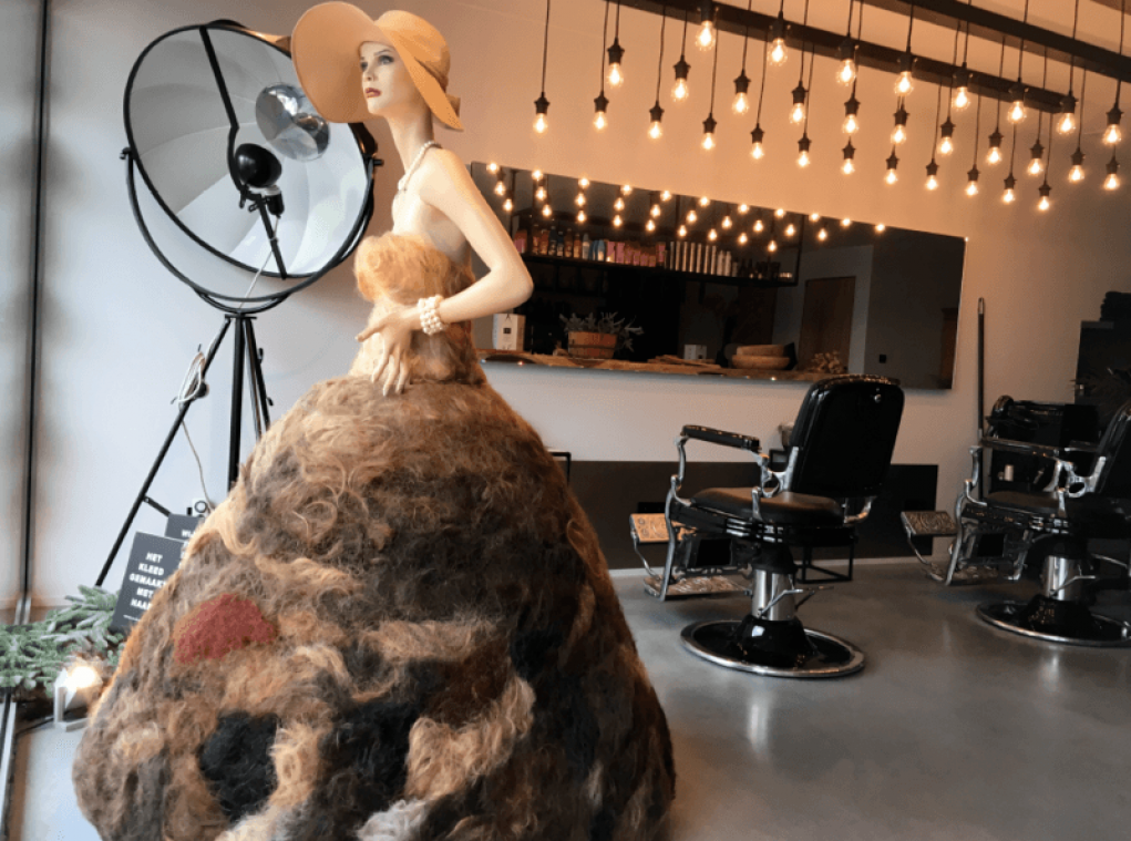 objecten leidt", en spaarde acht maanden lang alle plukjes haar die zijn klanten op de vloer achterlieten. Hij sorteerde de plukjes per kleur en bouwde met een hoepelrok, corset en beha als basis zijn menselijke bontjurk. De creatieve kapper bracht maar liefst 60 uur door op zijn logeerkamer om het ontwerp tot een goed einde te brengen. Daarbij werden 20 spuitbussen lijm gebruikt.