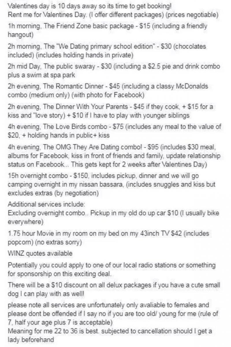 De Nieuw-Zeelandse jongeman wil de verloren tijd nu op een originele manier inhalen. De verschillende formules waarmee je zijn romantische diensten kan huren, lijstte hij op Facebook op.