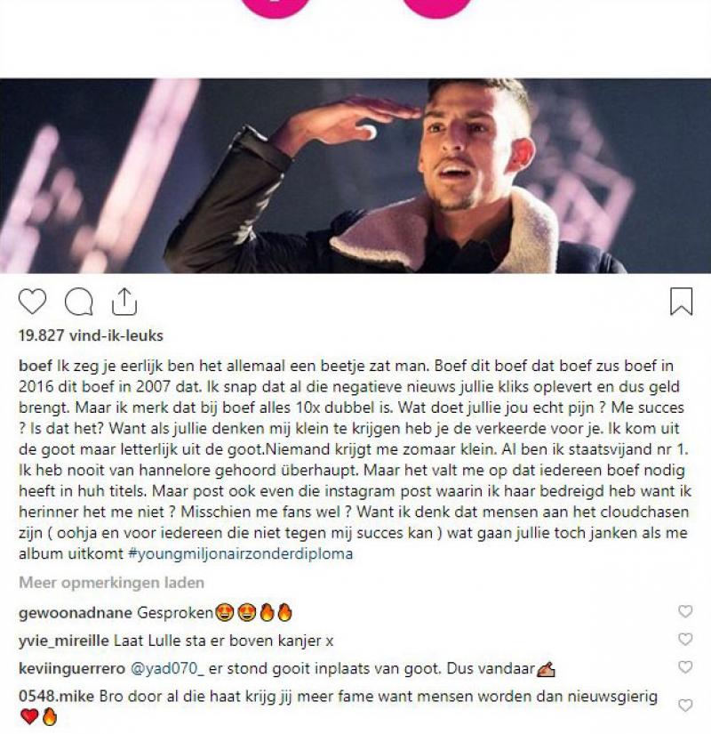 Ik kom uit de goot, maar letterlijk uit de goot. Niemand krijgt me zomaar klein. Al ben ik staatsvijand nr 1. Ik heb nooit van Hannelore gehoord überhaupt. Maar het valt me op dat iedereen Boef nodig heeft in hun titels. Maar post ook even die Instagrampost waarin ik haar bedreigd heb want ik herinner het me niet? Misschien mijn fans wel? Want ik denk dat mensen aan het cloudchasen zijn. Oohja, en voor iedereen die niet tegen mij succes kan, wat gaan jullie toch janken als mijn album uitkomt #youngmiljonairzonderdiploma, klinkt het.