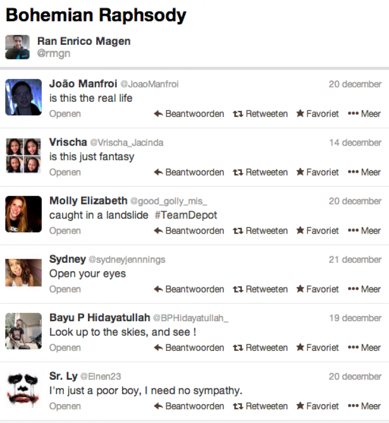 Sinds enkele maanden is het mogelijk om met Twitter een 'Custom Timeline' te maken. Dit is een functie waar je willekeurige tweets in een lijst kan samenbrengen. Dat kunnen bijvoorbeeld tweets rond eenzelfde thema zijn dat jij interessant vindt. Om aan te tonen wat je met deze functie allemaal kan, maakte Ran Enrico Magen - de computerexpert bij Twitter - wel een heel bijzondere tijdlijn. Hij bouwde namelijk de songtekst van Bohemian Rhapsody van Queen helemaal na uit tweets. Wie dus creatief met Twitter aan de slag wil, kan zich hierin helemaal uitleven.