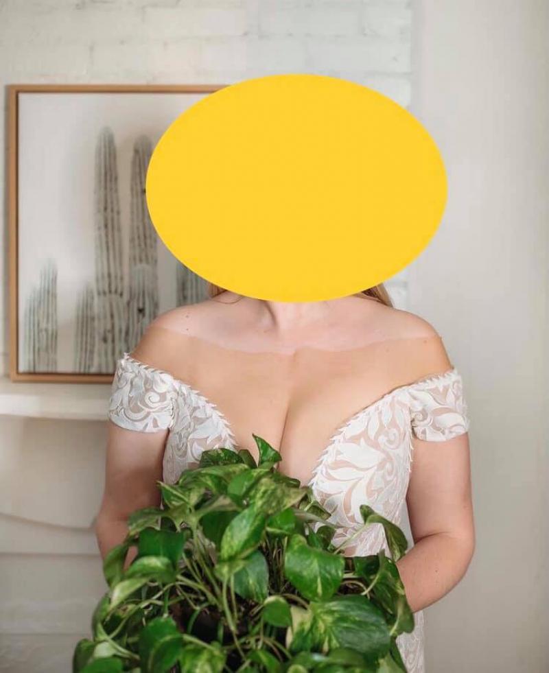 Er was echter nog een ander detail dat hen opviel. De huidskleur van haar nek en schouders verschilt van de kleur daaronder. Op het eerste zicht lijkt de vrouw een probleem te hebben gehad met haar bruiningscrème, maar het blijkt om het gaas van haar trouwjurk te gaan waardoor het verschil in huidskleur zichtbaar is. Ik dacht eerst dat ze zich slecht ingesmeerd had met bruiningscrème en Wat een zicht! Hoe kan je daar nu overkijken?, lezen we in de reacties.