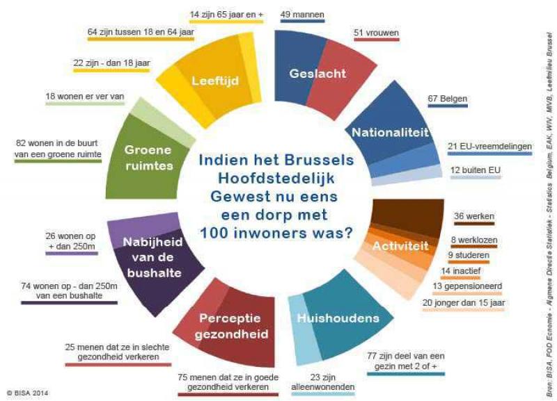 Het BISA creëerde ook de bovenstaande infographic. Op die infographic is het Brussels Hoofdstedelijk Gewest plots een dorp met 100 inwoners, in plaats van een metropool met meer dan een miljoen inwoners. Als alle verhoudingen hetzelfde blijven, dan zouden er in het dorpje Brussel 49 mannen en 51 vrouwen wonen. Zevenenzestig inwoners zouden de Belgische nationaliteit hebben, 21 zouden EU-onderdaan zijn en 12 zouden een niet EU-nationaliteit hebben.