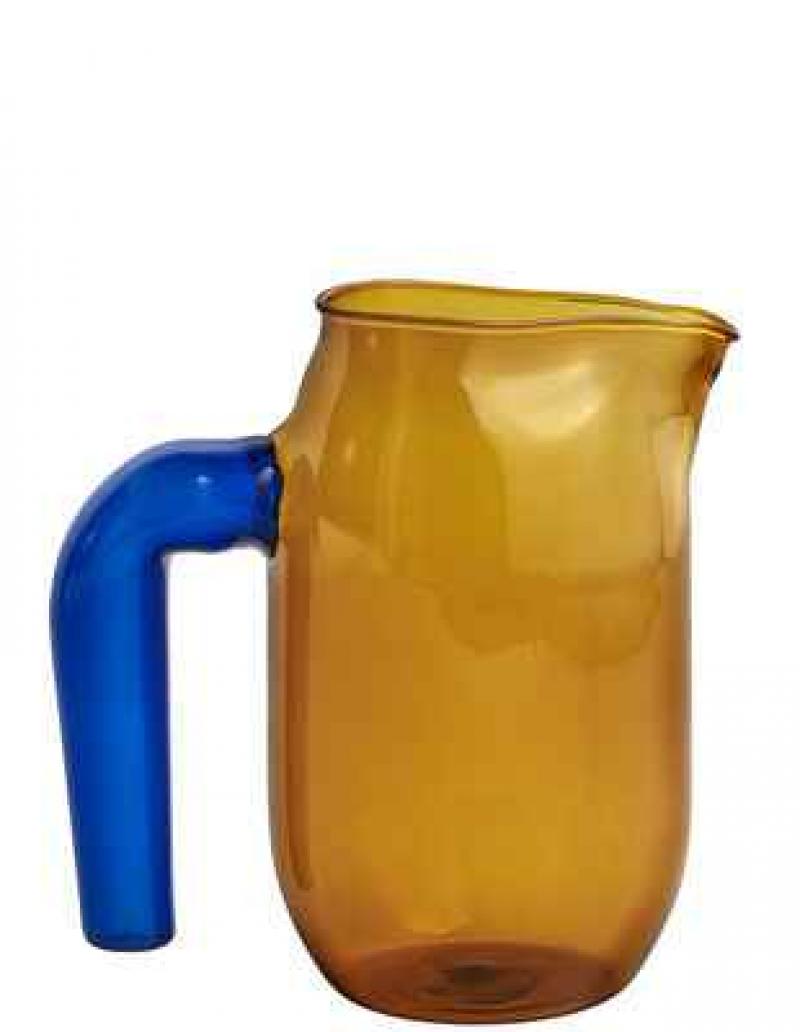 Deze amber- en blauwkleurige karaf in borosilicaatglas kan je vinden bij het Deense designbedrijf Hay. De kruik is bestand tegen hoge temperaturen. (35 euro)