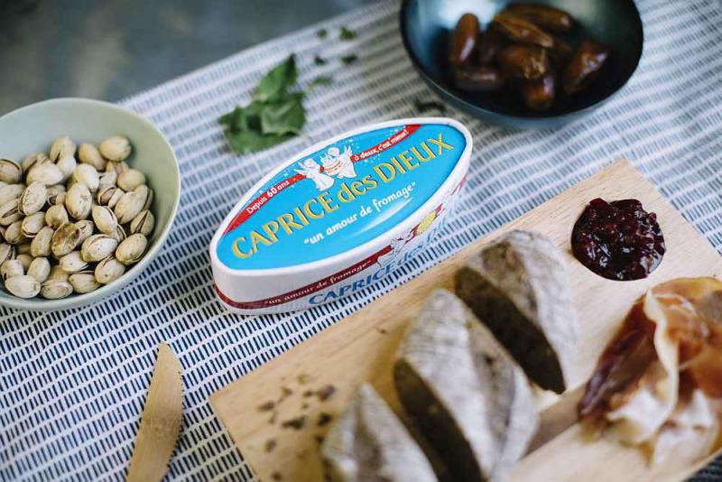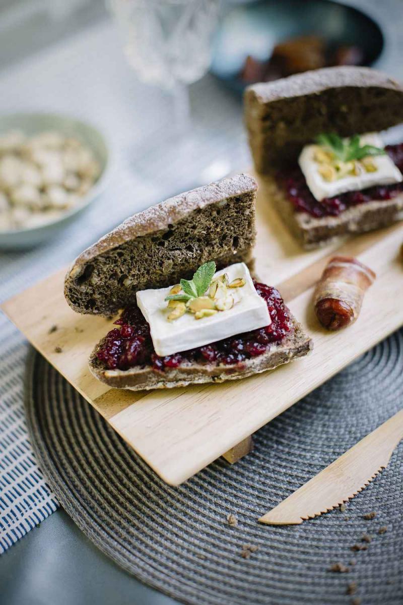 - Snij de baguettes in de lengte doormidden. Beleg de onderkant met een flinke laag veenbessenconfituur en twee sneetjes Serranoham. Snij de Caprice des Dieux in plakjes met een diameter van zo'n halve centimeter en leg die trapsgewijs op de ham.