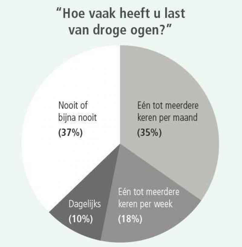 Uit de grafiek blijkt duidelijk dat droge ogen een niet te onderschatten probleem vormen: zes van de tien ondervraagden heeft er last van. De frequentie varieert van een of meerdere keren per maand (35%), over een keer of meermaals per week (18%) tot zelfs dagelijks voor zowat 10% van de deelnemers.