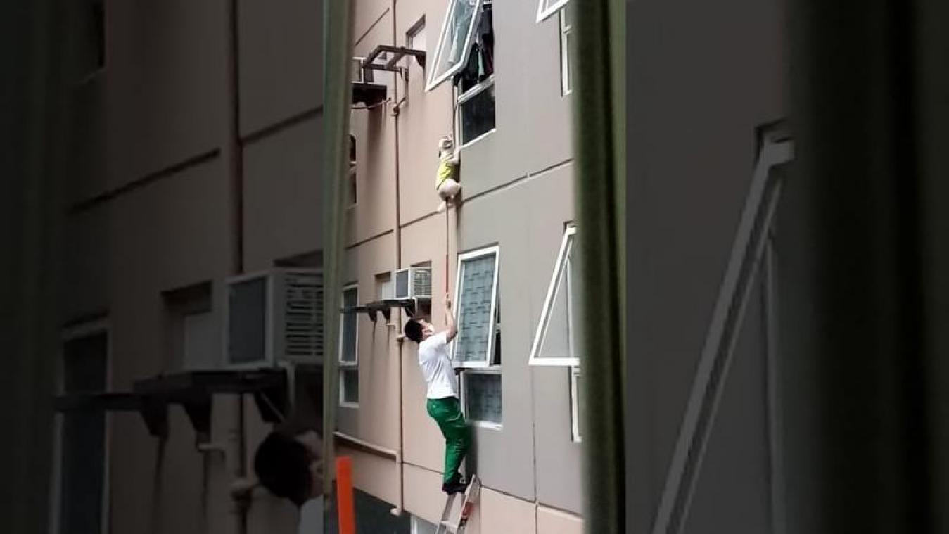 "Hij bleef zich vasthouden aan de muur zodat hij zichzelf niet zou wurgen. Maar gelukkig hing hij vast, anders was hij twee verdiepingen naar beneden getotterd", klinkt het bij een getuige. De twee mannen konden na enkele pogingen het hondje uit zijn benarde positie bevrijden. De baasjes waren op het moment van de feiten niet thuis.
