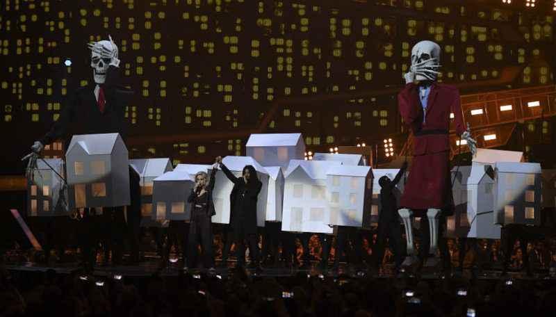 Katy Perry, die haar nieuwe single Chained to the rythm' bracht, was een van de opmerkelijkste acts van de avond. Ze werd vergezeld door de kleinzoon van Bob Marley, Skip, en twee kolossale skeletten die Donald Trump en Theresa May moesten voorstellen tijdens een bezoek aan het Witte Huis. De zangeres protesteerde daarmee tegen hun beleid.