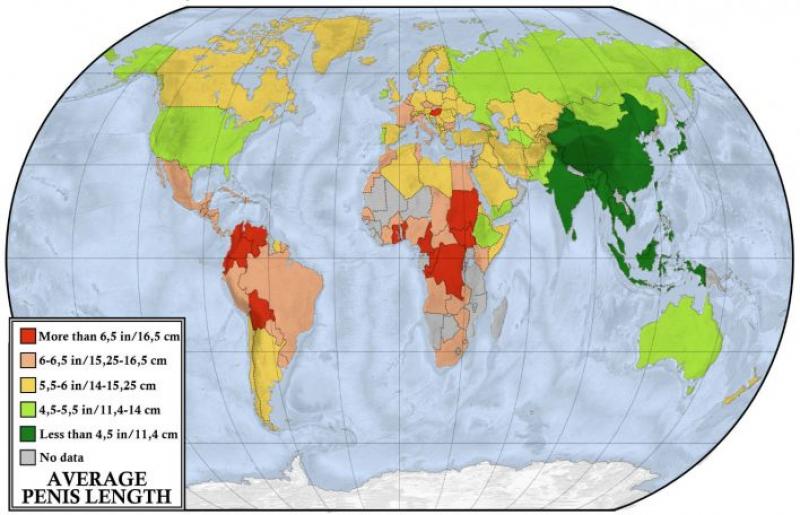 In België zou de gemiddelde lengte tussen de 15,3 en 16,5 centimeter bedragen. Niet slecht, maar de grootste jongeheren vind je in Zuid-Amerika en Afrika. Het cliché dat Aziaten het kleinst geschapen zijn, wordt ook bevestigd.