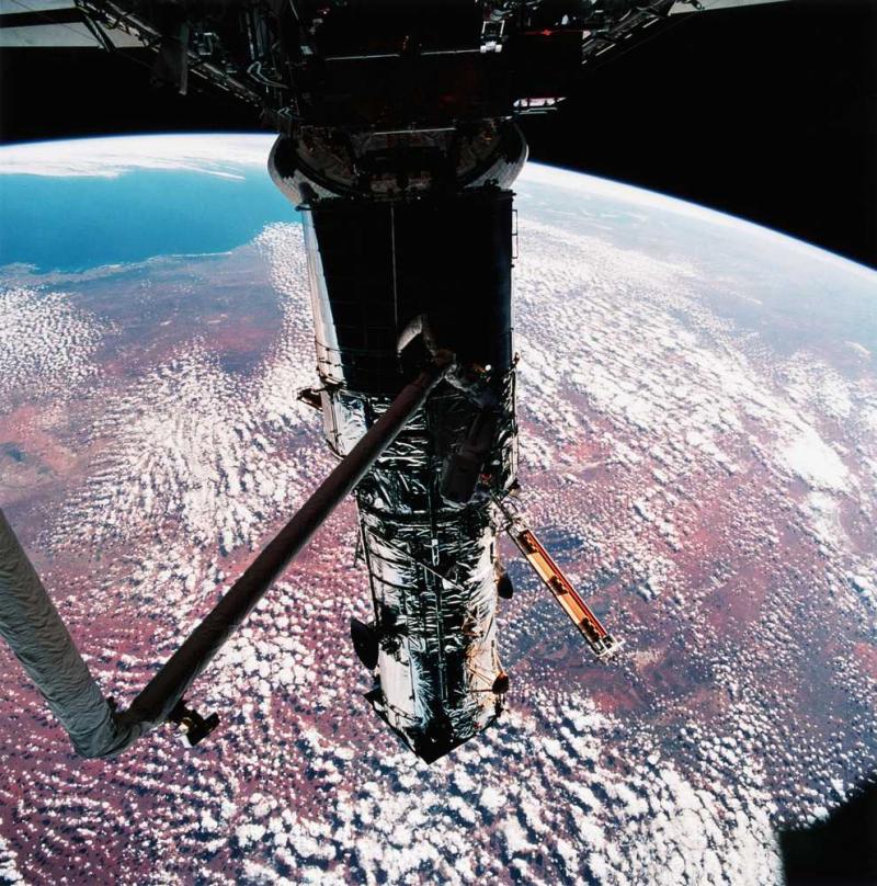 6. Een astronaut, ergens verstopt in de schaduw, werkt aan de zonnepanelen van de Hubble Space Telescope. Op de achtergrond zie je onze planeet.
