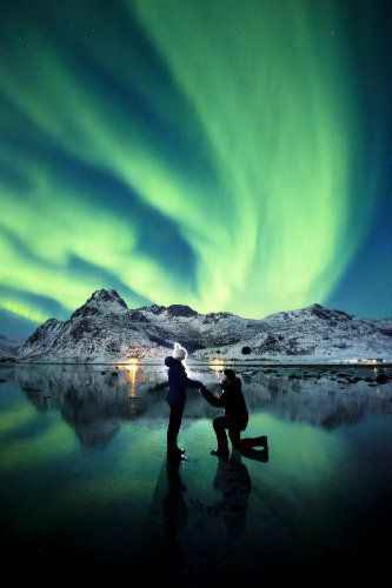 Maanden na de eerste poging ging het koppel nog eens op vakantie naar Scandinavië. Wanneer de fotograaf zijn materiaal had klaargemaakt voor een foto, knielde hij onverwachts. De huwelijksfoto gaat nu de hele wereld rond.