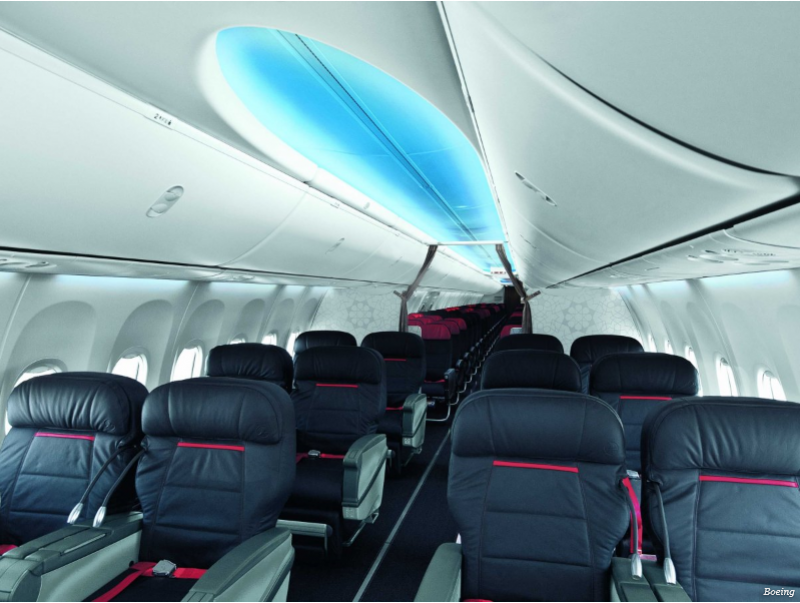 Vliegtuigfabricant Boeing zet tegenwoordig sterk in op een helder interieur. Dat zorgt voor een meer kalmerend effect en zo lijkt het er ook op dat het vliegtuig groter is. Grote panelen aan het plafond worden uitgerust me LED-lichten. Deze zijn blauw overdag en roze wanneer het buiten donker wordt.