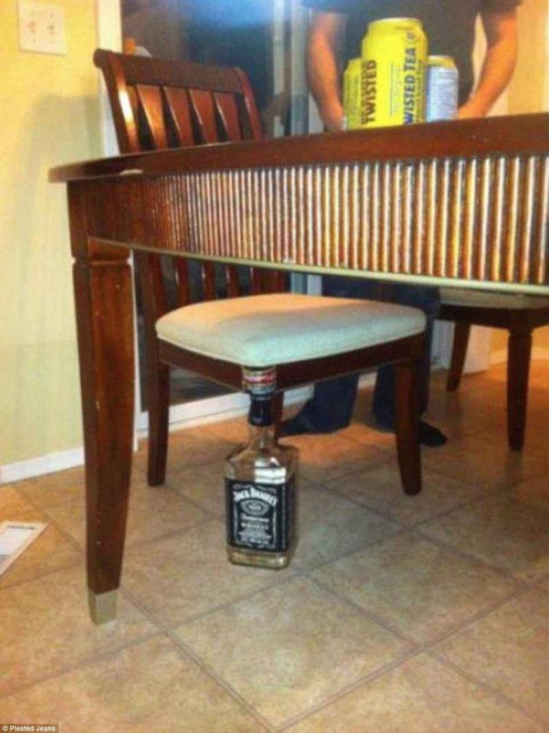 Het bewijs dat lege flessen hun nut hebben. Meteen ook een mooi excuus om te drinken. Je kan immers nooit weten wanneer je een geïmproviseerde poot nodig hebt.