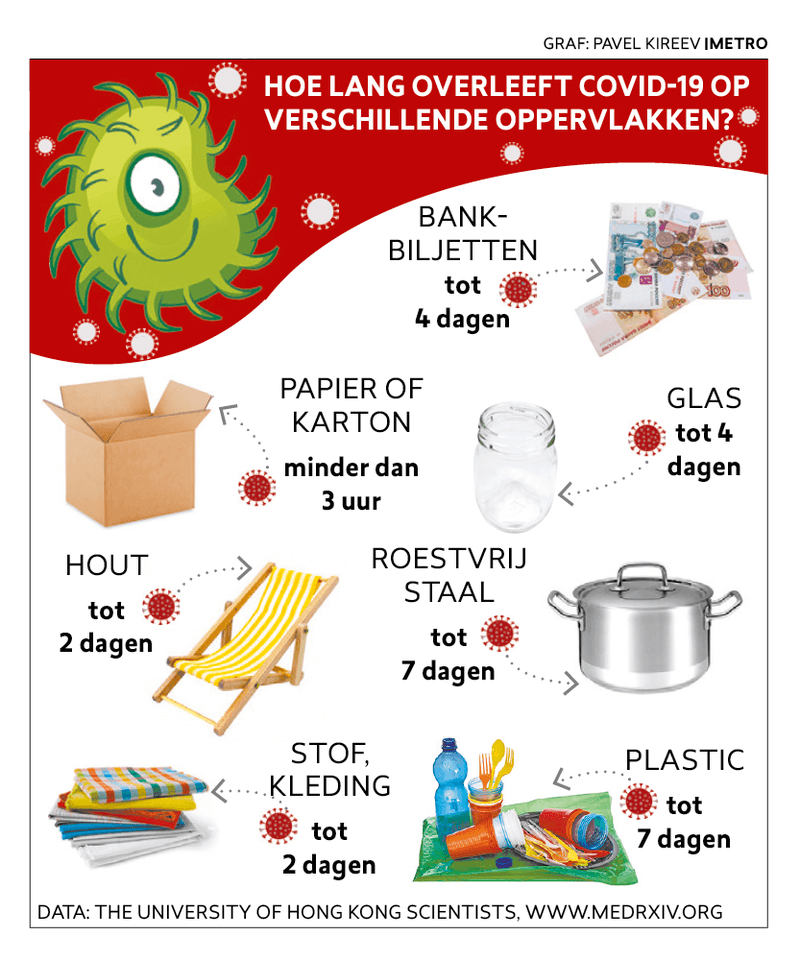 Zo is de kans klein dat er drie uur na een aanraking nog levende virusdeeltjes zullen zitten op papier of karton. Daarentegen kunnen de beestjes tot zeven dagen blijven leven op plastic of roestvrij staal. Kleren of handdoeken kunnen twee dagen dienen als onderkomen voor het virus. Het is wel belangrijk om mee te geven dat het aantal virusdeeltjes meteen begint af te nemen. Een T-shirt of plastic fles kan je na enkele dagen nog besmetten, maar die kans verkleint elke dag stelselmatig. Bovendien volstaat het om een object af te wassen met zeep om het te ontsmetten. Ook vaak je handen wassen kan een besmetting voorkomen.