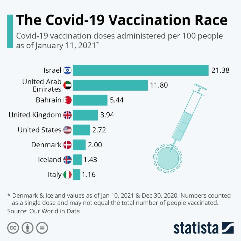 De bijna 2 miljoen verdeelde vaccins in Israël komen neer op 21,38 doses per 100 inwoners. De nummer 2, de Verenigde Arabische Emiraten, volgt ver daarachter. Het Arabische land gaf nu al 11,8 doses per 100 mensen. Bahrein maakt de top drie compleet, maar ook het Verenigd Koninkrijk is op stoom om de bevolking zo snel mogelijk in te enten. De Britten gaan nu ook extra hard, nu ook het Oxford/AstraZenecavaccin is goedgekeurd.