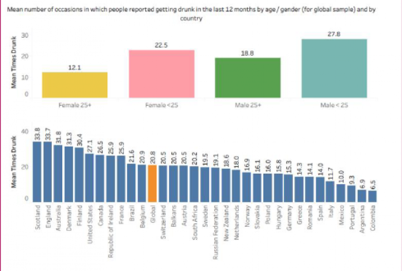 Het Global Drug Survey neemt het globale alcoholgebruik onder de loep. De Schotten zeggen het afgelopen jaar gemiddeld zo'n 34 keer dronken te zijn geweest. Hun zuiderburen uit Engeland volgen op korte voet, terwijl de Australiërs gemiddeld 32 keer te diep in het glaasje keken.