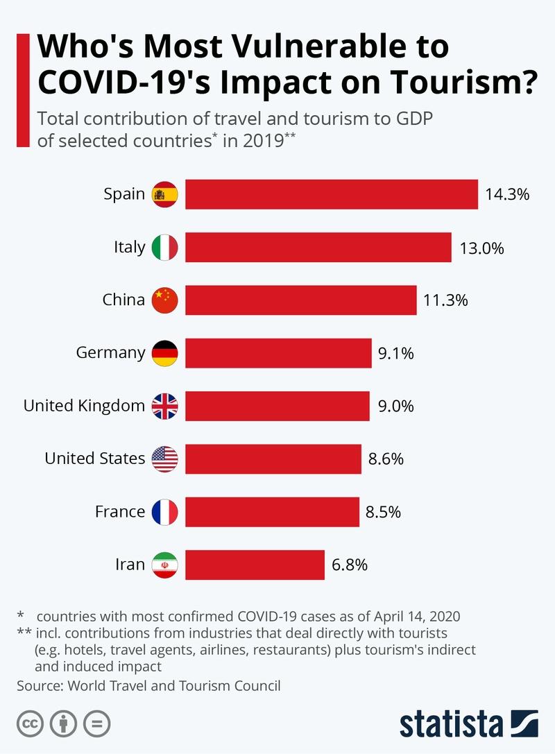 De twee Zuid-Europese landen waren nog nauwelijks hersteld van de crisis van 2008 en kampten nog altijd met de hoogste staatsschulden en werkloosheidscijfers van alle OESO-landen. Door het coronavirus wordt vooral het toerisme hard getroffen. Weinig landen zijn zo afhankelijk van toeristen als Spanje en Italië. Dat is goed te zien in onderstaande grafiek, die is gebaseerd op cijfers van de World Travel & Tourism Council (WTTC).
