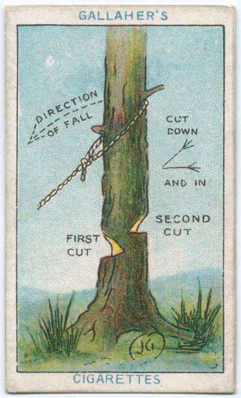 "Beslis eerst naar welke kant je de boom wil doen vallen. Snij daarna twee inkepingen in de boom zoals op de afbeelding. Trek uiteindelijk de boom om door een touw te gebruiken."