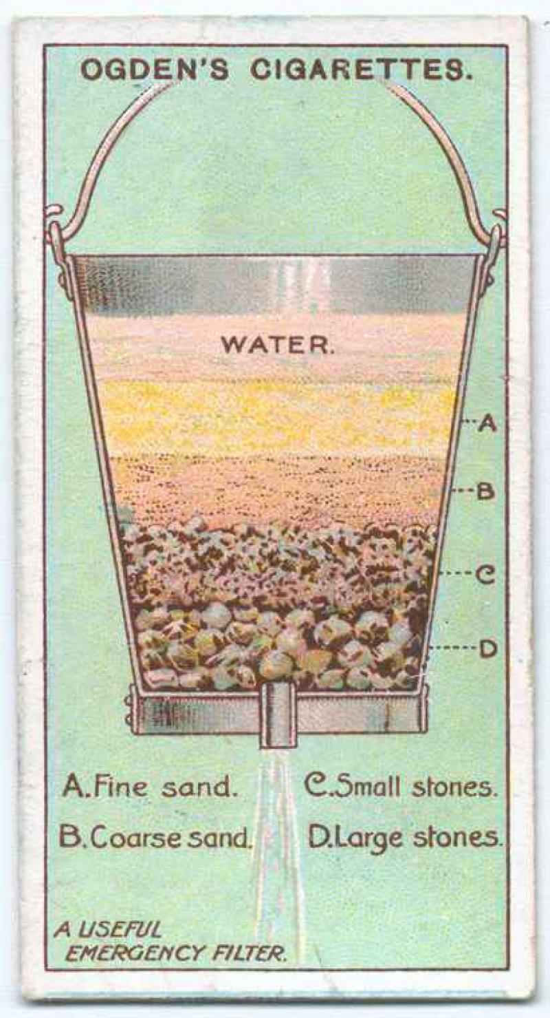 "Een zeer handige en effectieve filter kan worden gemaakt van een gewone wateremmer. Vul de emmer met de lagen zoals ze op de tekening staan aangeduid. Het water sijpelt door de lagen van fijn en grof zand, grind en stenen, waarna het in heldere toestand langs de bodem in je glas kan sijpelen."
