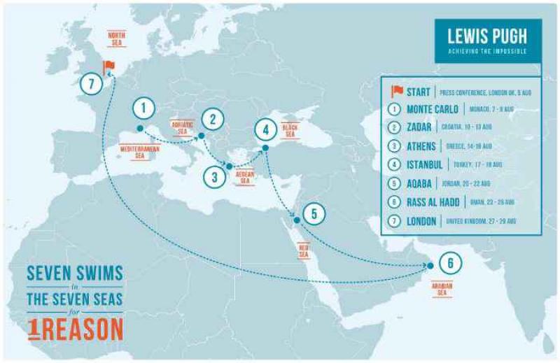 In augustus krijgen zeven zeeën een bezoekje van Lewis Gordon Pugh. Hij zal zwemmen in de Middellandse Zee, de Adriatische Zee, de Egeïsche Zee, de Zwarte Zee, de Rode Zee, de Arabische Zee en uiteindelijk in de Noordzee. Op zeven locaties zal hij ook een speech houden, waarmee hij hoopt mensen te inspireren om meer zorg te dragen voor onze zeeën en oceanen en de dieren die erin leven.