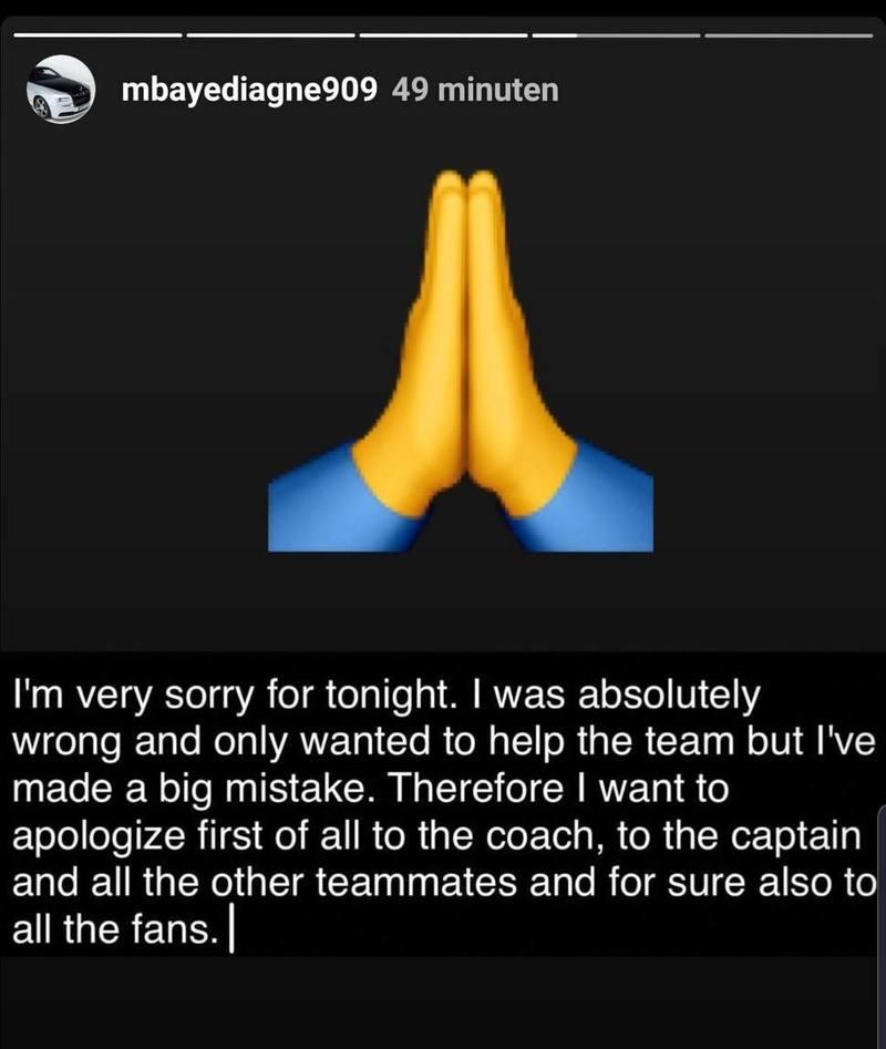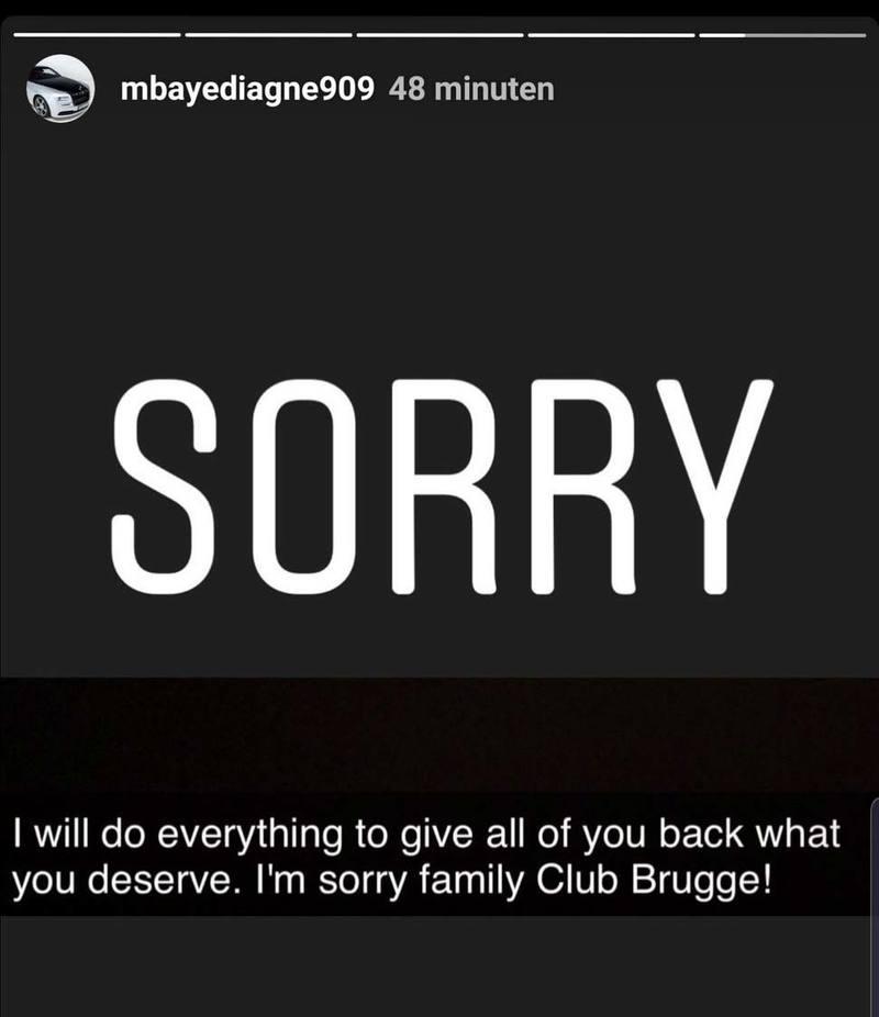 Intussen heeft Diagne zich publiekelijk verontschuldigd voor het incident. Het spijt me zeer erg. Ik wilde het team helpen, maar ik heb een grote fout gemaakt. Ik heb het helemaal verkeerd aangepakt. Ik wil me eerst en vooral excuseren bij de coach, de aanvoerder en alle andere ploegmaats. En natuurlijk ook bij de supporters. SORRY. Ik zal alles doen om te geven wat jullie verdienen. Het spijt me zeer, Club Brugge-familie, klinkt het op Instagram.