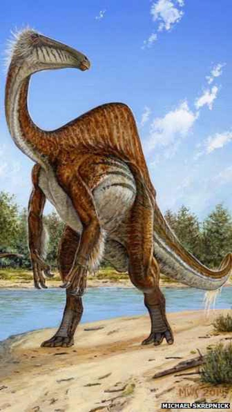 Maar sinds de ontdekking van twee volledige skeletten in Mongolië is de wilde speculatie voorbij. Het internationale onderzoeksteam zegt dat het beest ongeveer 11 meter groot was en meer dan 6 ton woog. Het had een langwerpig hoofd met een eend-achtige snavel en een groot zeil op zijn rug. De benen waren kort en stomping en groeiden uit tot hoefachtige poten, waardoor de onderzoekers denken dat de dino maar een trage beweger zou zijn geweest.