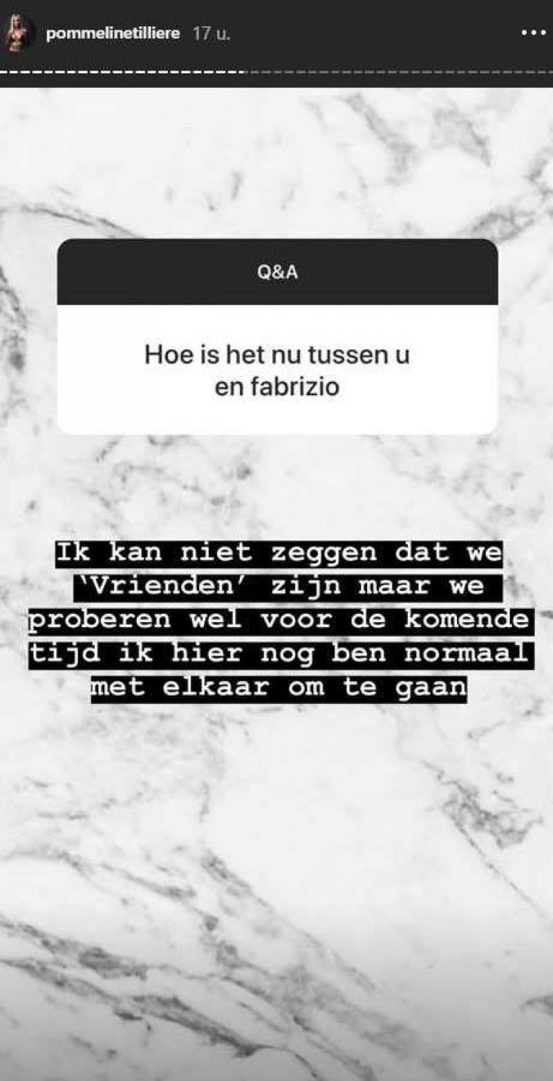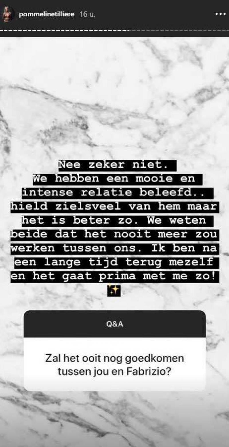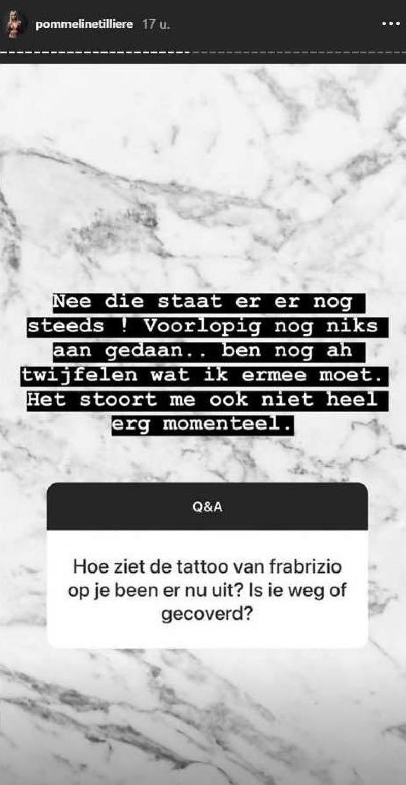 Pommeline heeft destijds een tatoeage van Fabrizio op haar been laten zetten. "En die staat er nog steeds. Voorlopig heb ik er nog niets aan gedaan. Ik ben nog aan het twijfelen wat ik ermee moet doen. Het stoort me niet echt momenteel, klinkt het.