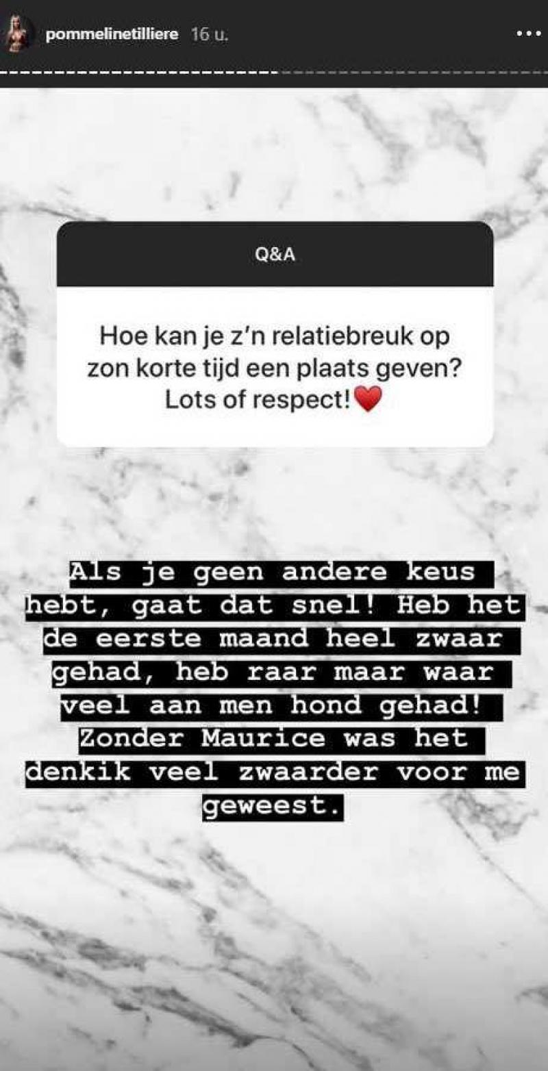 Op Instagram liet Pommeline weten hoe ze met die situatie is omgegaan. Zo vroeg iemand of ze intussen over het verdriet heen is. Als je geen andere keuze hebt, gaat dat snel! Ik heb het de eerste maand heel zwaar gehad, maar heb raar maar waar veel aan mijn hond gehad. Zonder Maurice was het veel zwaarder geweest, denk ik, schrijft ze.