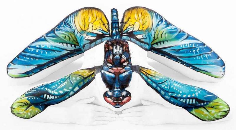 Je ziet een gracieuze giraffe, een helder gekleurde libel en een spin. Op het eerst gezicht zien ze er allemaal uit als wonderen van het dierenrijk. Maar kijk een beetje beter en je zult zien dat de dieren eigenlijk vrouwen zijn die prachtig beschilderd zijn en in een buitengewone pose zitten.