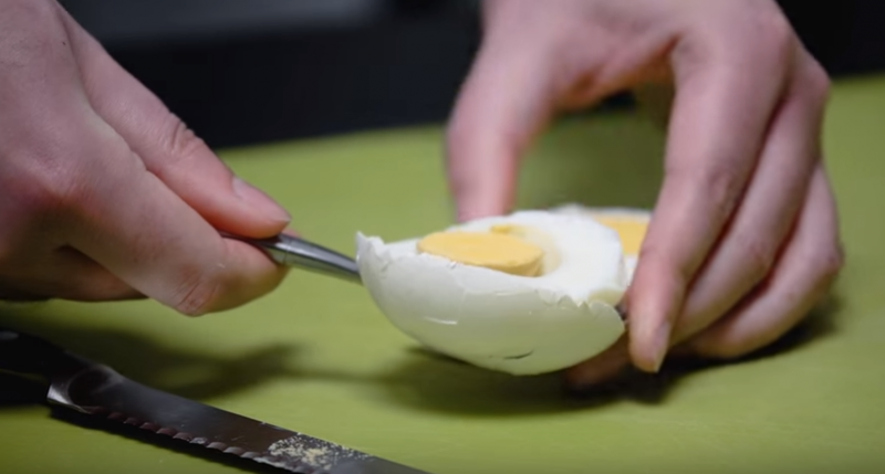 Tip 4: Snijd het hardgekookte ei doormidden en lepel de eierhelften eruit.