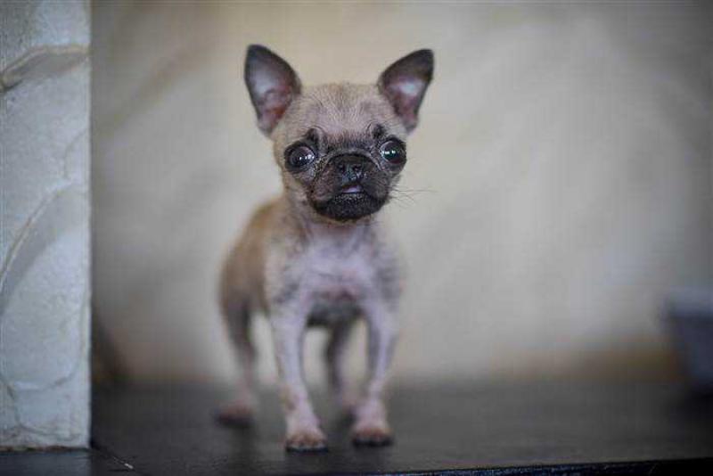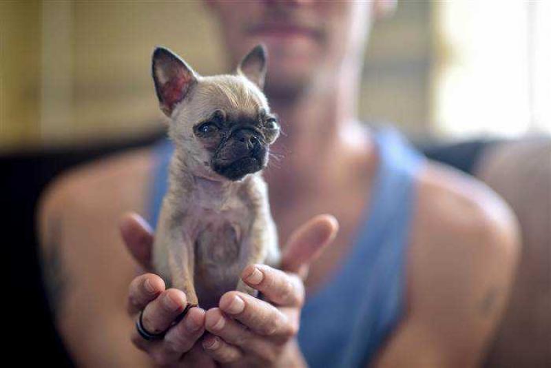 Dit is Pip, de schattigste mopshond van Dudley in Engeland. De puppy is 4 maanden oud, weegt minder dan een halve kilogram en is ongeveer 11 centimeter groot. De kleine hond werd in januari geboren in een nest met drie andere puppy's die allemaal nu dubbel zo groot zijn als haar.