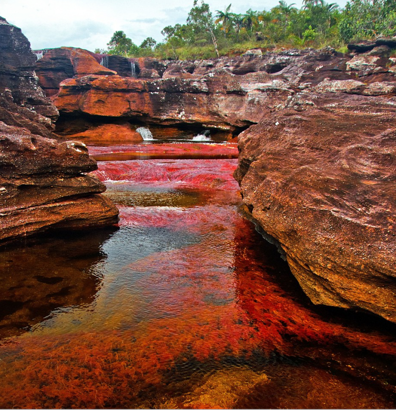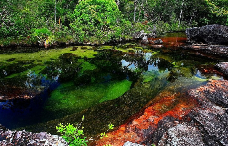 De Caño Cristales in Colombia wordt door velen beschouwd als de mooiste rivier van de wereld. De stroom staat bekend als de vloeibare regenboog doordat de spectaculaire wateren worden omgezet naar een regenboog dankzij de felgekleurde zoetwaterplanten als de macarniea clavigera. Tijdens de korte tijd tussen het regen- en het droge seizoen in juli en november helpen de planten samen met mos, waterplanten en koralen om de rivier een mix van kleur te geven onder het oppervlak.