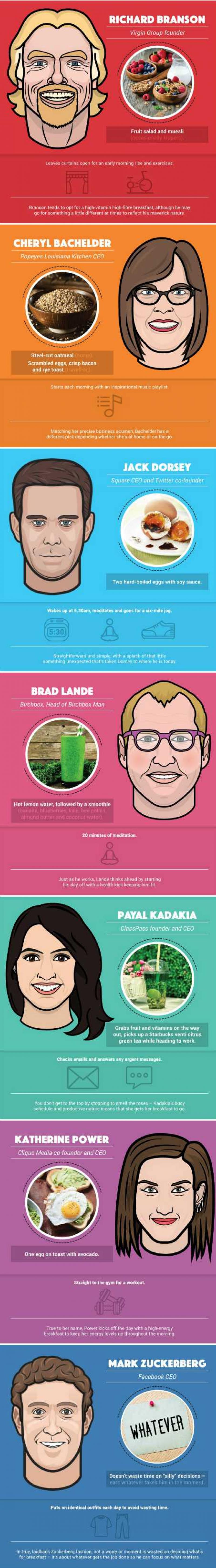 Heb je wat inspiratie nodig? Het Britse consultancybedrijf Make It Cheaper ging raad vragen bij zeven ceo's en polste naar hun favoriete ontbijt.