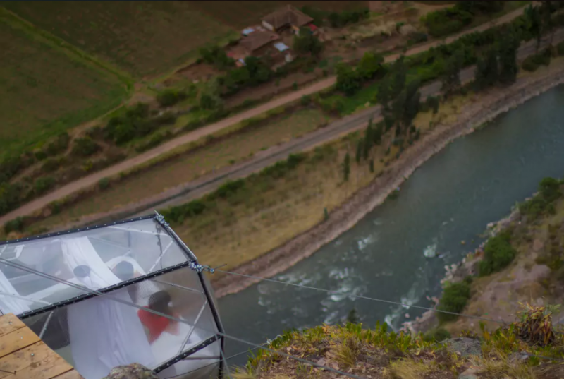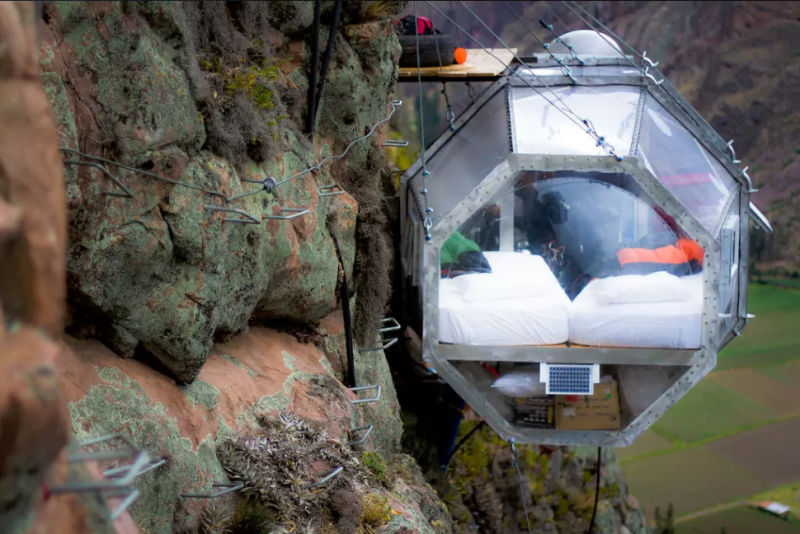 Voor je je overnachtingsplaats bereikt, moet je zo'n 400 meter klimmen. De beloning is echter navenant. Je slaapt in een volledig doorzichtige cabine die als een adelaarsnest tegen de rotswand hangt. 's Ochtends, na je luxeontbijt, kan je met een zipline naar beneden glijden.