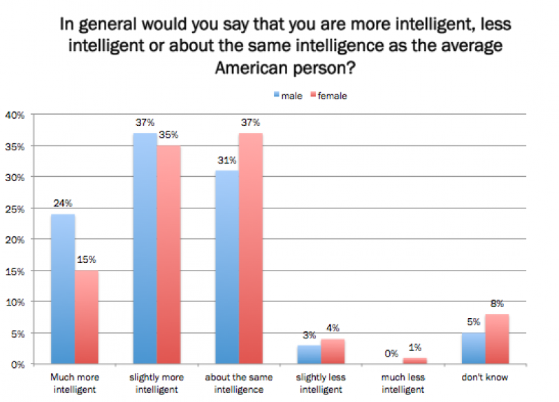 Als je de resultaten per gender bekijkt, valt het op dat één vierde van de mannen zegt dat hij veel intelligenter is dan de doorsnee Amerikaan, terwijl slechts 15% van de vrouwen dat denkt.