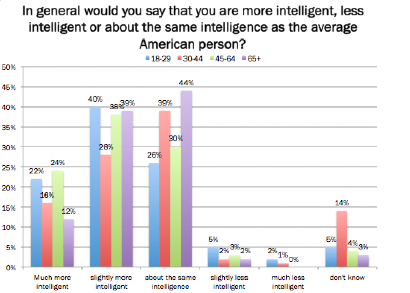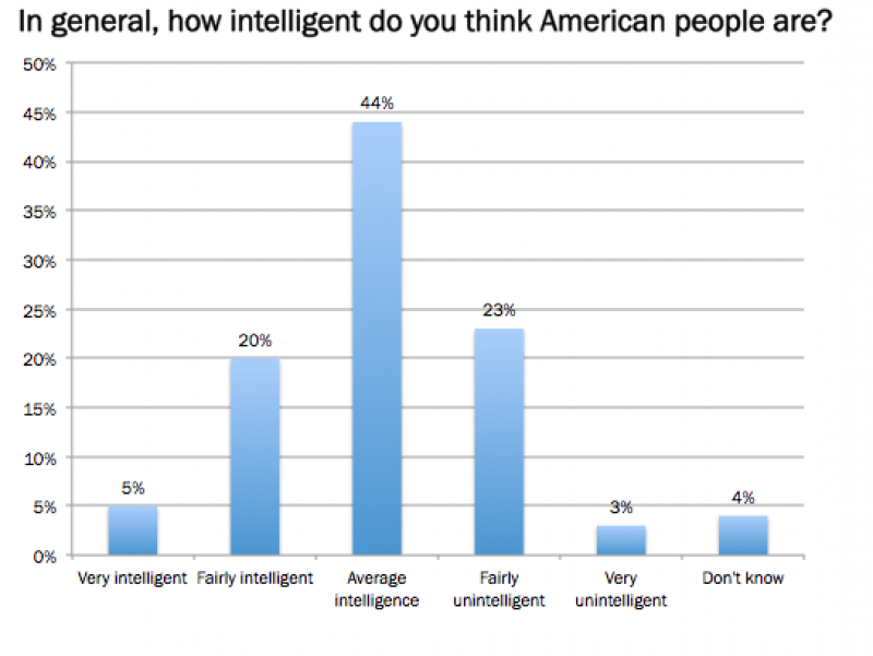 Het onderzoek vroeg ook hoe slim ze een gemiddelde Amerikaan schatten ten opzichte van de rest van de wereld. Ondanks het beeld dat veel Amerikanen denken dat ze superieur zijn aan de rest van de wereld, denkt ongeveer de helft dat een doorsnee Amerikaan even intelligent is als een doorsnee inwoner van de rest van wereld.