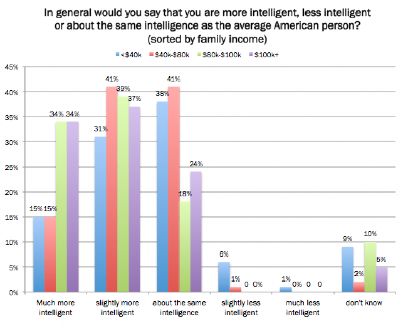 Als je de resultaten per inkomenscategorie bekijkt, merk je dat mensen die meer dan 80.000 dollar verdienen geneigd zijn om te zeggen dat ze intellectueel superieur zijn.