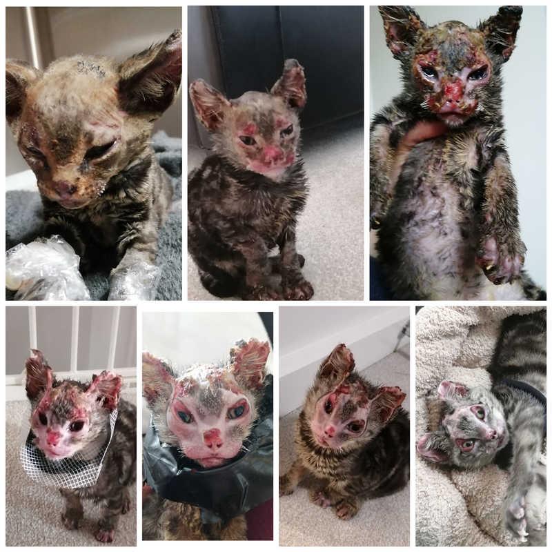 Zijn ogen, oren en snorharen waren ongelooflijk verbrand, gaat Jenni verder. Ook zijn lipjes waren helemaal weg. Hij rook naar verbrande haren omdat zijn vacht helemaal verschroeid was. Op een gegeven moment begon zijn huid te vervellen.