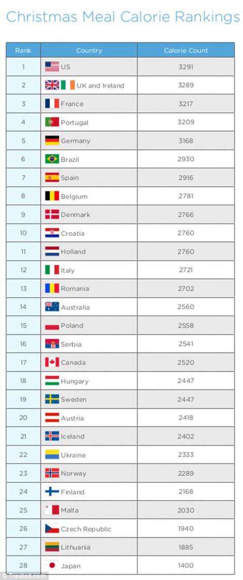 Binnenkort kunnen we ons tijdens de feestdagen weer volstoppen met eten. Veel eten. Een studie van treated.com, onder leiding van dokter Wayne Osborne, heeft onderzocht in welke landen (die Kerstmis vieren) het feestmaal de meeste calorieën bevat. Dat de Verenigde Staten op de eerste plaats staan, is niet verrassend. Maar wist je dat België met 2.781 calorieën plaats nummer acht bekleedt? Buurland Frankrijk staat op de derde plaats met 3.217 calorieën. In Japen (1.400), Litouwen (1.885) en Tsjechië (1.940) doet men iets gezonder' met een maaltijd tussen 1.400 en 2.000 calorieën.