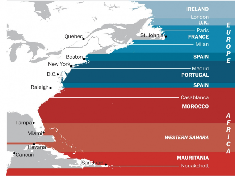 Onderstaande kaart toont bijvoorbeeld de Oostkust. We merken dat de Spaanse hoofstad Madrid op dezelfde hoogte ligt als New York, terwijl Washington de breedtegraad deelt met de Portugese hoofdstad Lissabon.