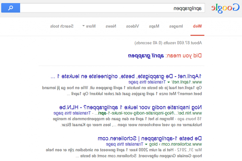 De echte grap is com.google. Alles wat je intypt in de zoekmachine op de website wordt achterstevoren geschreven. Google heeft zelfs een goede reden verzonnen voor de zoekmachine. Volgens het bedrijf is het tijd dat mensen nadenken over wat ze doen en is het belangrijk om eens achterom te kijken. Daarom hebben ze vanaf vandaag com.google gelanceerd. "De zoekmachine geeft ons de gelegenheid om na te denken over onze inspanningen door de resultaten eens op hun kop te zetten."