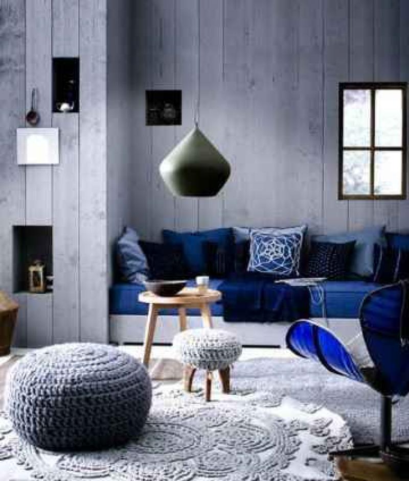 Hoewel de strakke Scandinavische woonstijl nog niet helemaal gepasseerd is, zien we dat de bijbehorende witte interieurs stilaan worden vervangen door donkerblauwe, diepblauwe en marineblauwe varianten.