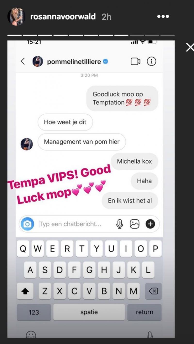 Het gerucht doet al even de ronde, maar het koppel ontkende de deelname steevast. Nu verkondigt Rosanna, die vorig jaar deelnam een Temptation Island VIPS', dat Pommeline ook haar kans gaat wagen. Rosanna deelde een schermafbeelding van het gesprek tussen de vedetten waar ze haar feliciteerde op haar deelname. Het management van Pommeline was verbaasd en vroeg hoe ze dit nieuws wist.