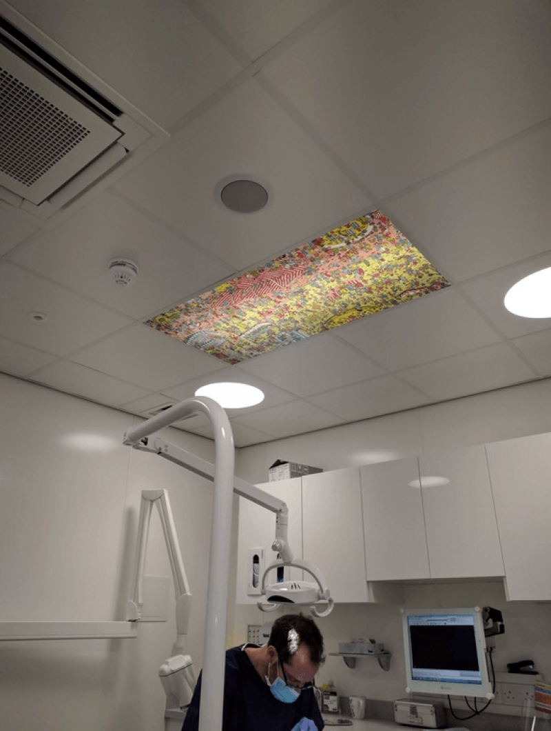 Veel mensen hebben enorm veel schrik om naar de tandarts te gaan. Je ligt machteloos op een oncomfortabele stoel met je mond open terwijl een man in witte schort met allerlei electronica tegen je tanden schuurt. Om de patiënten af te leiden van deze harde werkelijkheid, heeft een Britse tandarts een Waar is Wally?'-afbeelding op zijn plafond aangebracht. Geen nood: ook als je Wally vlug spot, kun je nog altijd wegdromen bij al de andere details in de tekening.