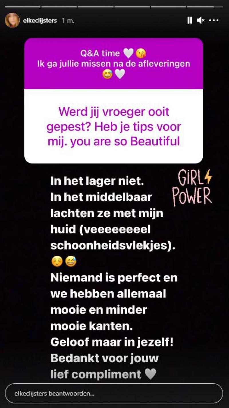 Op Instagram vroeg een fan haar of ze vroeger gepest werd. Elke gaf daar een heel eerlijk antwoord op. In de lagere school niet. In het middelbaar lachten ze met mijn huid (veel schoonheidsvlekjes). Niemand is perfect en we hebben allemaal mooie en minder mooie kanten. Geloof maar in jezelf!, klinkt het.