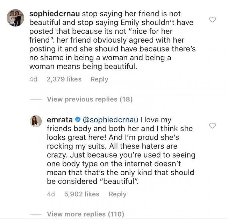 Vorige week postte het 27-jarige model een strandkiekje van zichzelf en haar vriendin Caitlin King. Beide dames dragen daarop badkleding van Emily's swimwear-lijn Inamorata. Enkele Instagramvolgers vonden het ongepast dat Emily naast de volslankere' Caitlin poseerde. Je hebt deze foto bewust gepost om aan te tonen dat jouw lichaam mooier is dan dat van je vriendin, reageerde iemand. Dik zijn is noch mooi, noch gezond. Laten we alstublieft niet hypocriet doen, schreef iemand anders.