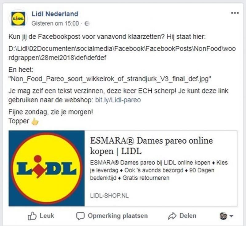 De social media-manager van Lidl had duidelijke instructies gekregen over wat hij moest doen met een bepaalde Facebook-post. De arme persoon in kwestie voerde gewillig zijn job uit, alleen vergat hij de instructies uit het bericht te halen. "Kun jij de Facebookpost voor vanavond klaarzetten? Hij staat hier. Je mag zelf een tekst verzinnen, deze keer ECH scherp!", staat er nog bij. "Fijne zondag, zie je morgen!".