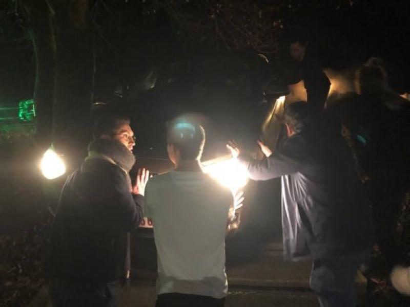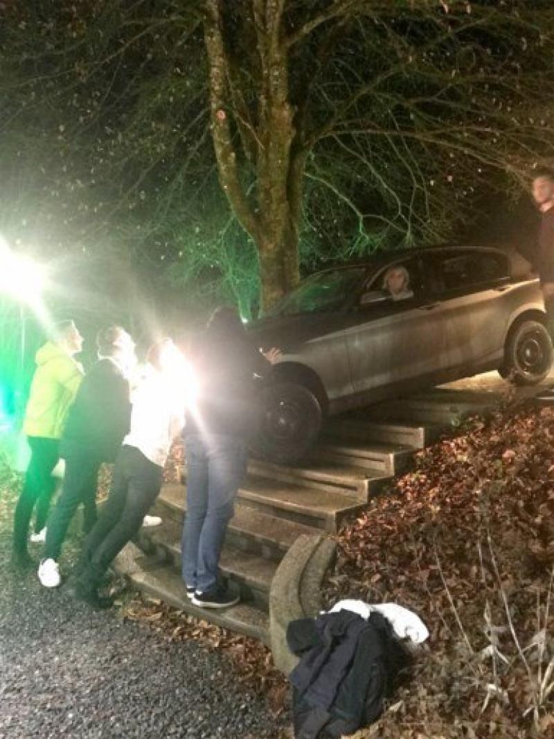 Kerkhofs nam de linkse splitsing en had in het donker niet gezien dat ze op het verhoog moest stoppen. Ze reed rechtdoor en kwam met haar BMW vast te zitten op de trappen.