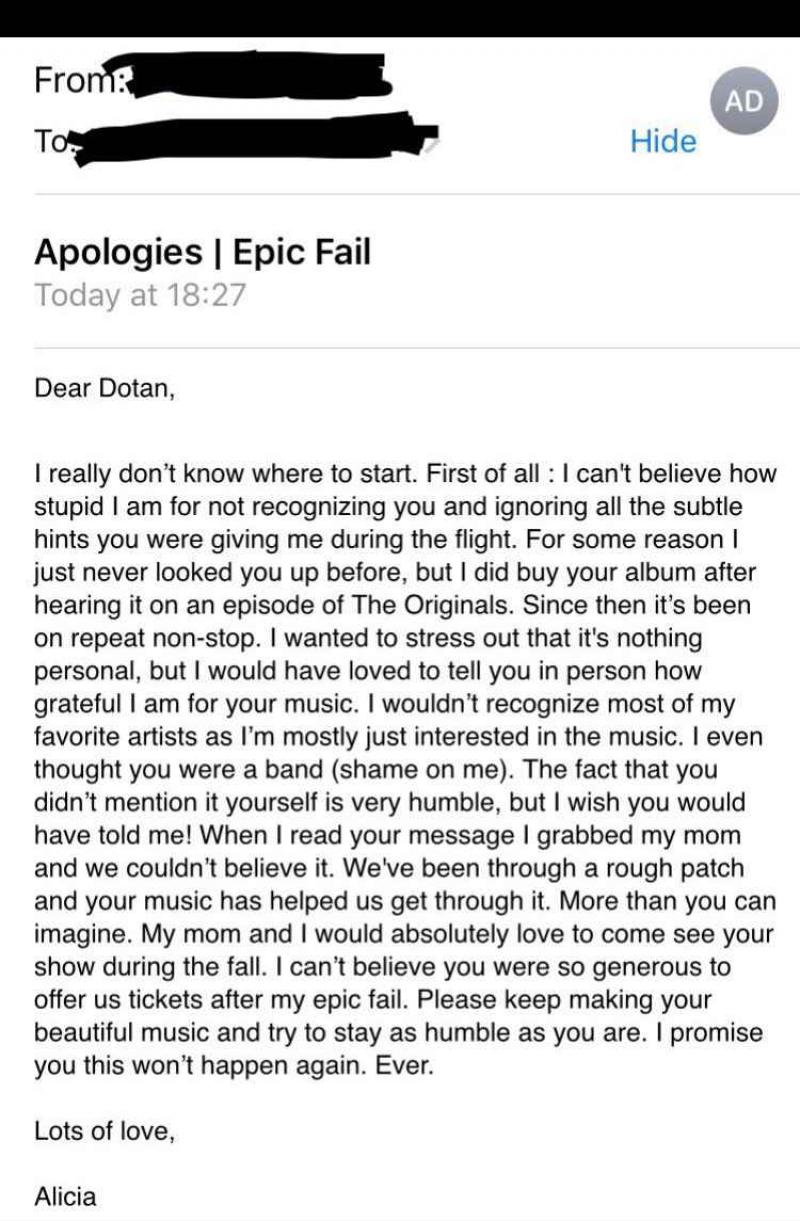 Mijn mama en ik zouden het fantastisch vinden je dit najaar eens aan het werk te zien. Ik kan niet geloven dat je ons zo nog tickets hebt gegeven na die epic fail. Blijf alsjeblieft prachtige muziek maken en blijf zo bescheiden als je bent. Ik beloof je dat dit nooit meer zal gebeuren. Nooit. Veel liefs, Alicia.